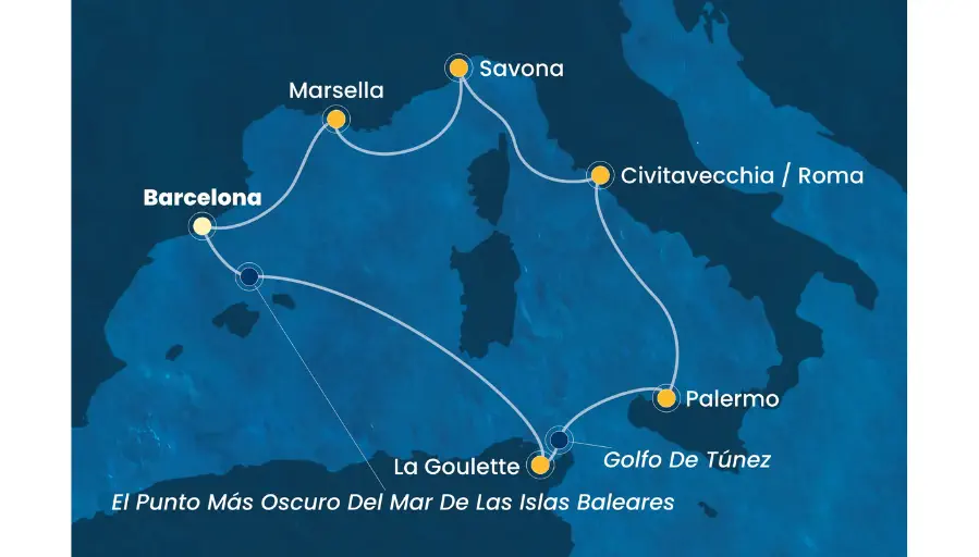 En el corazón del golfo de Túnez, el barco se sitúa en el punto perfecto para disfrutar de una vista panorámica de la bahía, donde la costa africana se abre hacia Europa. El sol desciende lentamente, incendiando el mar y el cielo con sus reflejos cálidos. En el puente, ritmos vibrantes y actuaciones en directo llenan el ambiente de energía. La luz del atardecer, los sabores y aromas mediterráneos, junto con detalles inspirados en las tradiciones tunecinas, convierten el momento en una experiencia para todos los sentidos. Cuando el sol roza la línea de la costa africana, la magia del crepúsculo envuelve el golfo.
